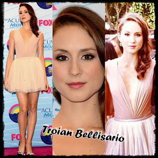 A linda Troian (Spencer) optou por um look mais clássico e moderno. Um vestido com corte em V, utilizando um tecido fino. No make apostou num delineador, sombra clara.